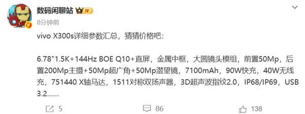 【CNMO科技消息】3月23日,有数码博主汇总了vivo X300s的详细参数。据CNMO了解,vivo X300s将于3月30日19:00与vivo X300 Ultra一同发布。